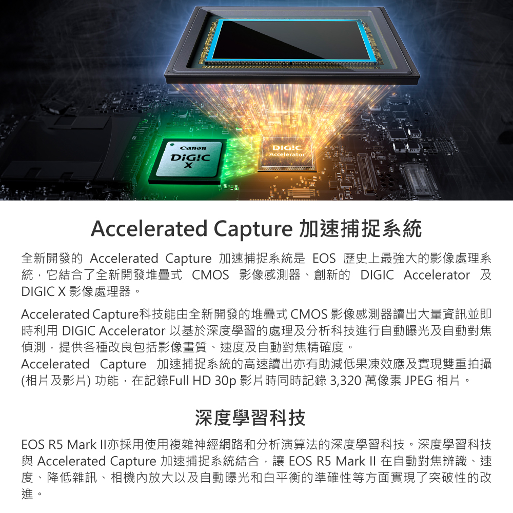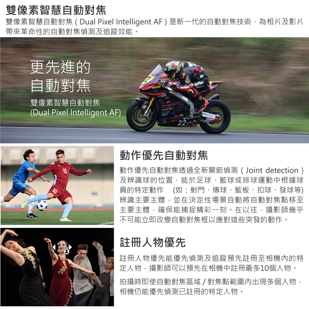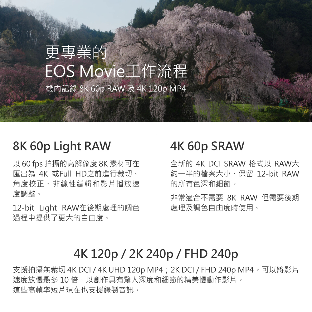 搭載45MP全幅感光元件與DIGIC X影像處理器,提供卓越的畫質與極速性能,支援8K 60fps超高畫質影片及4K 120fps慢動作錄影,滿足影像製作的各種需求。