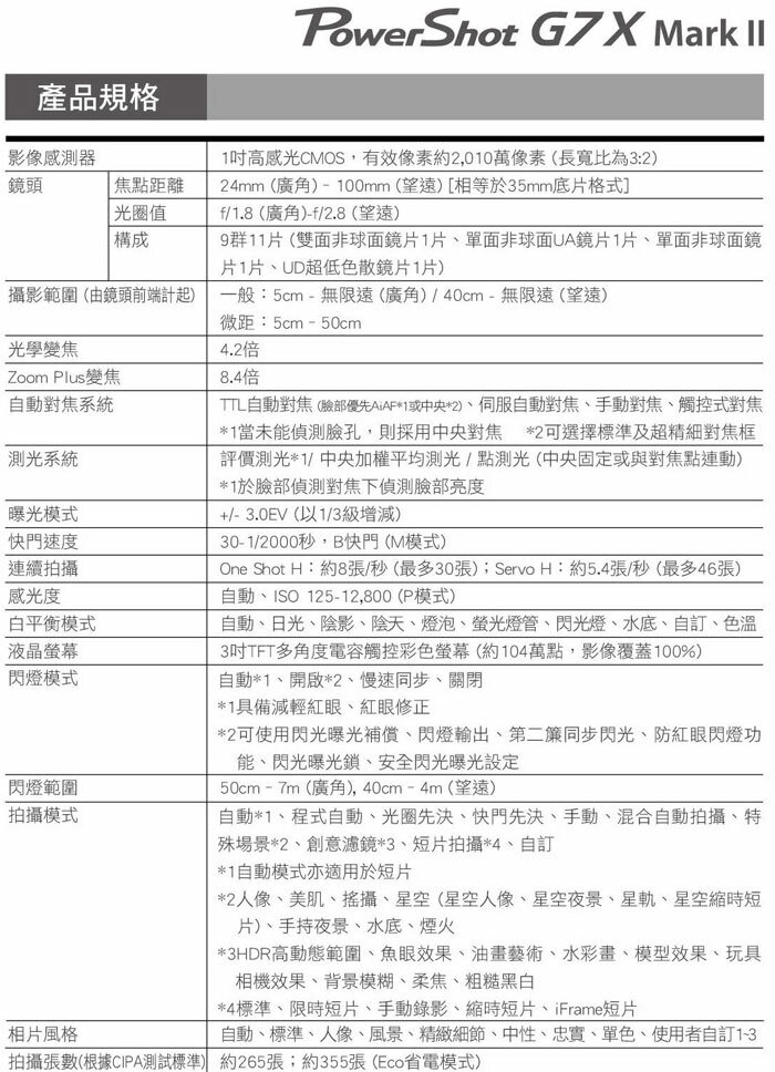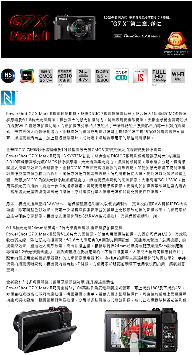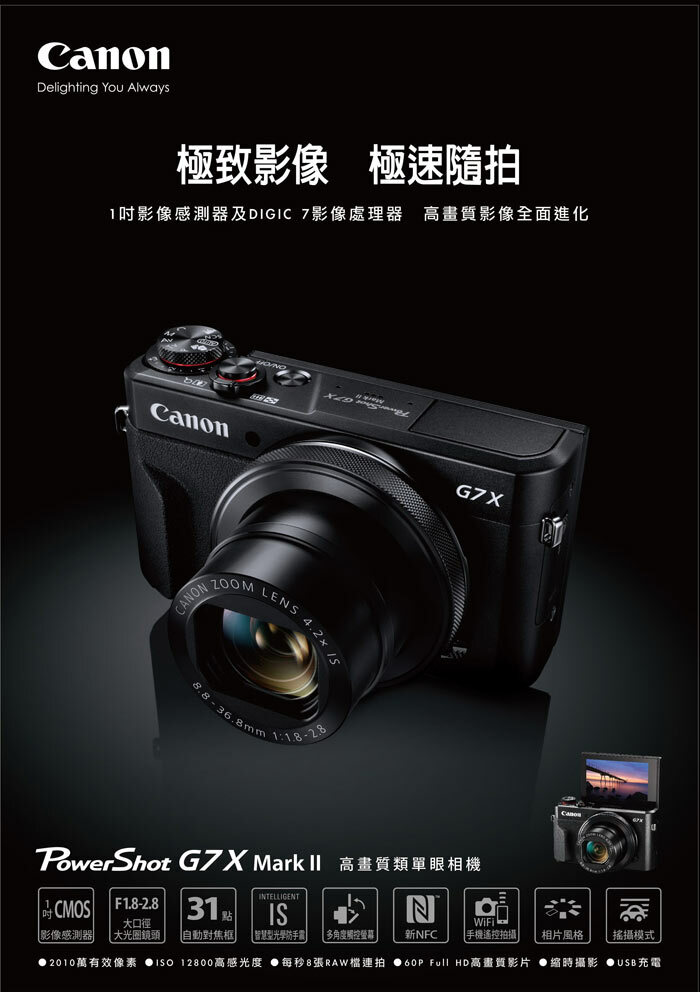 Canon G7X Mark II 採用 1 吋 2010 萬畫素 CMOS 感光元件與 DIGIC 7 影像處理器