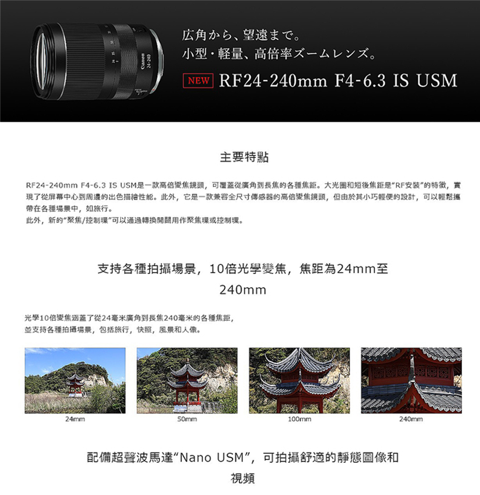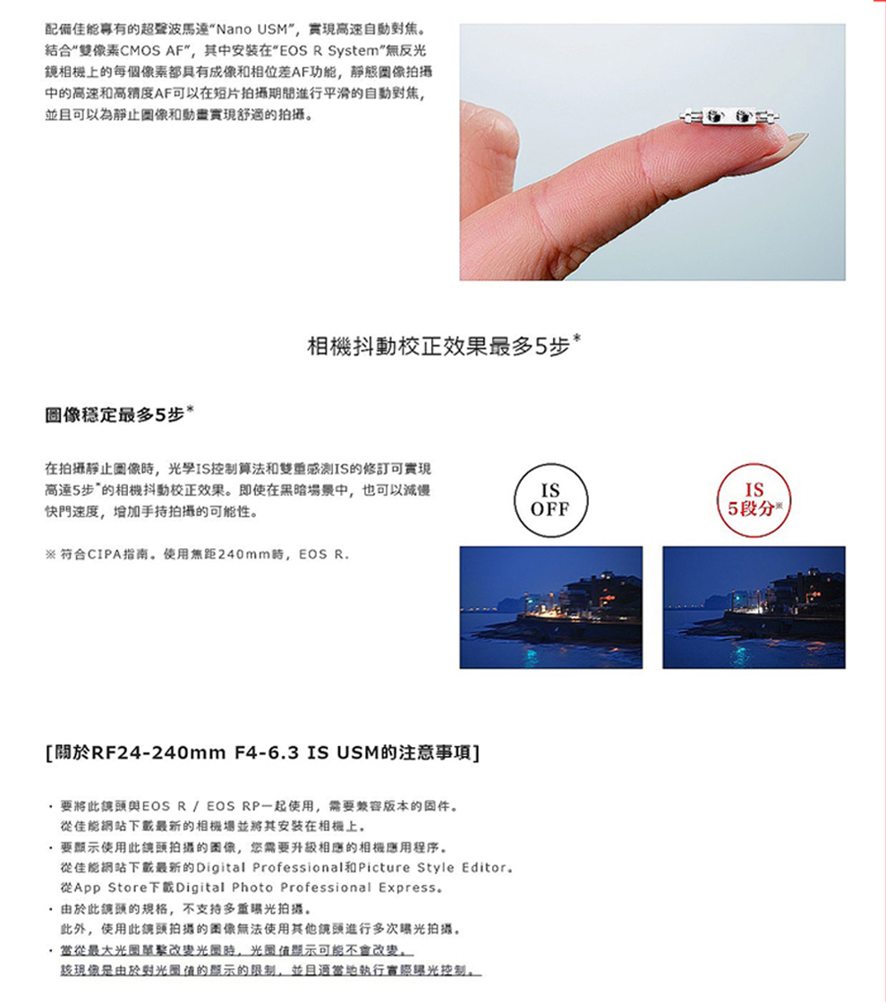 24mm廣角至望遠焦距的10x高倍,5級防震效果