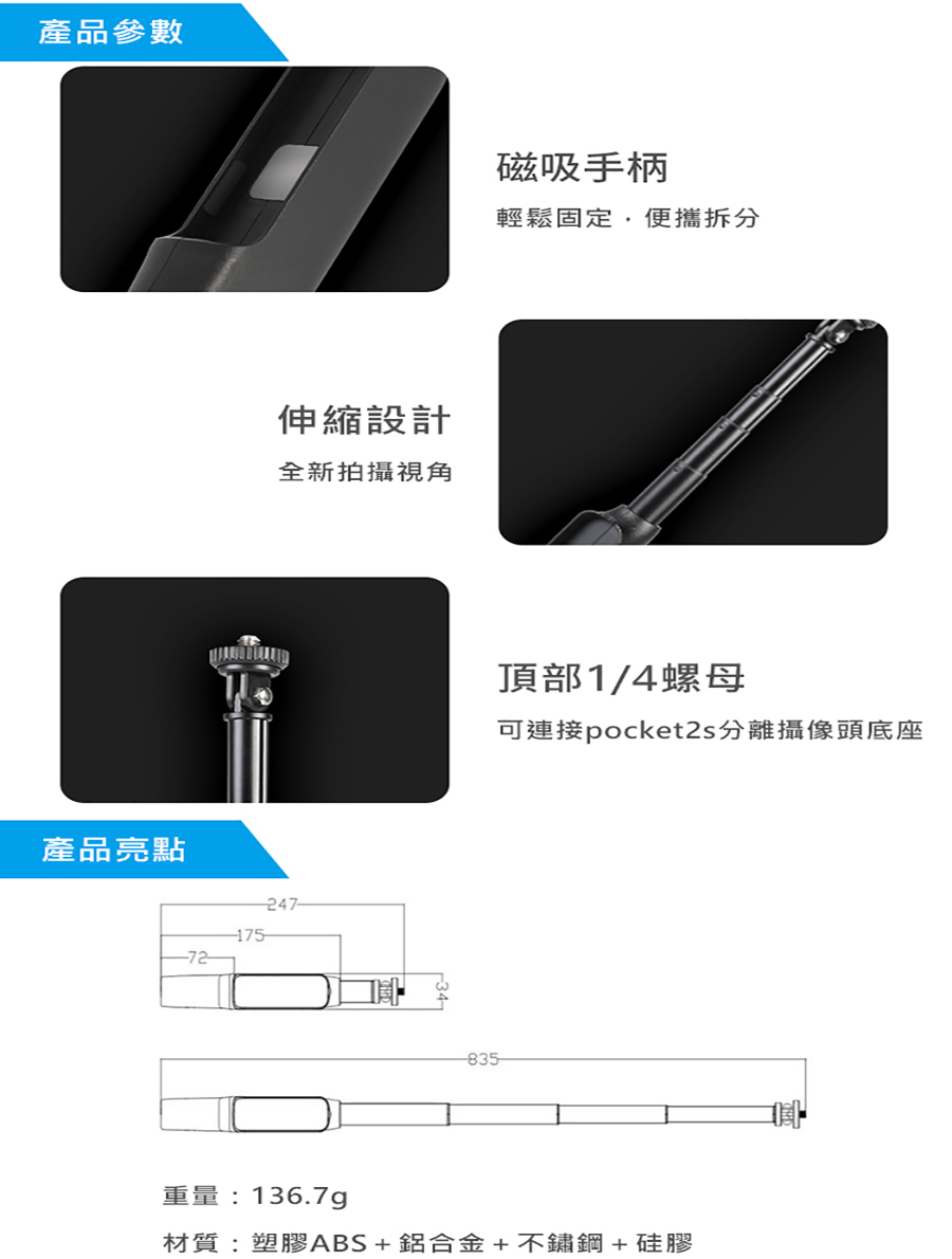 頂部1/4螺母,完美連接POCKET 2S鏡頭