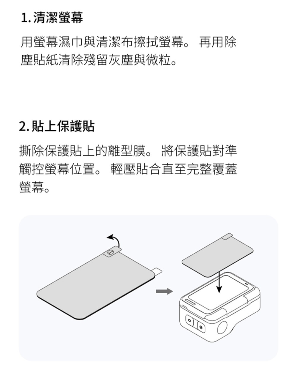 保護貼安裝工具組*1(內含螢幕清潔布*2、除塵貼紙*2、螢幕濕巾*2)