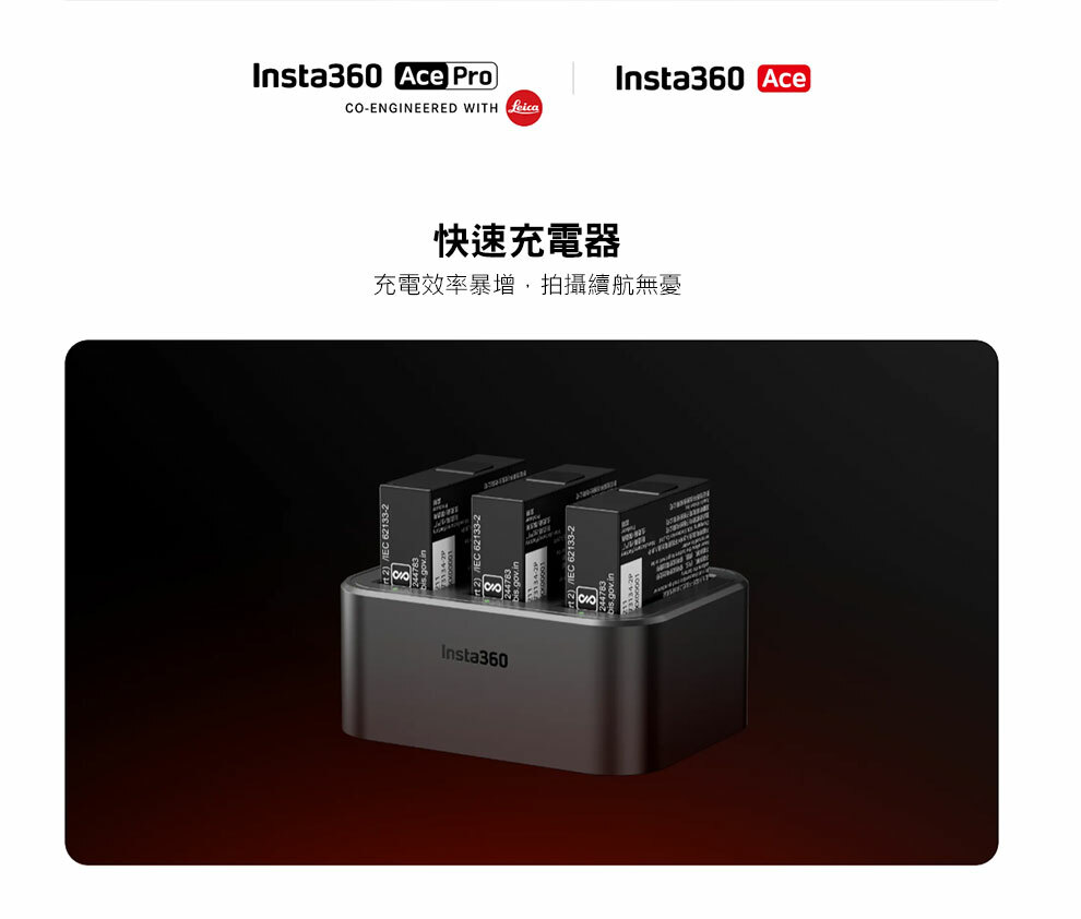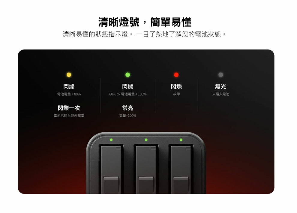 可同時快速為最多三顆電池充電