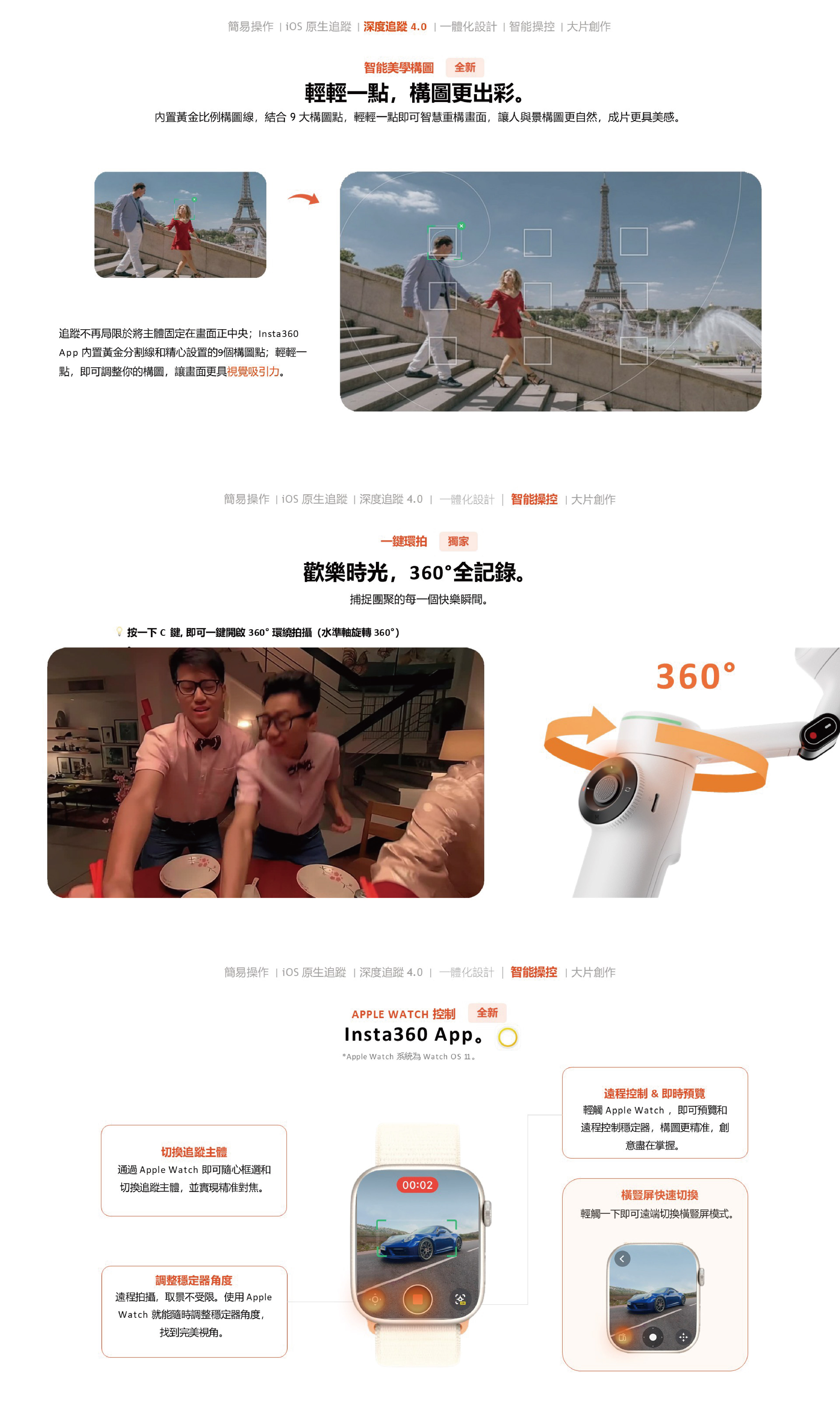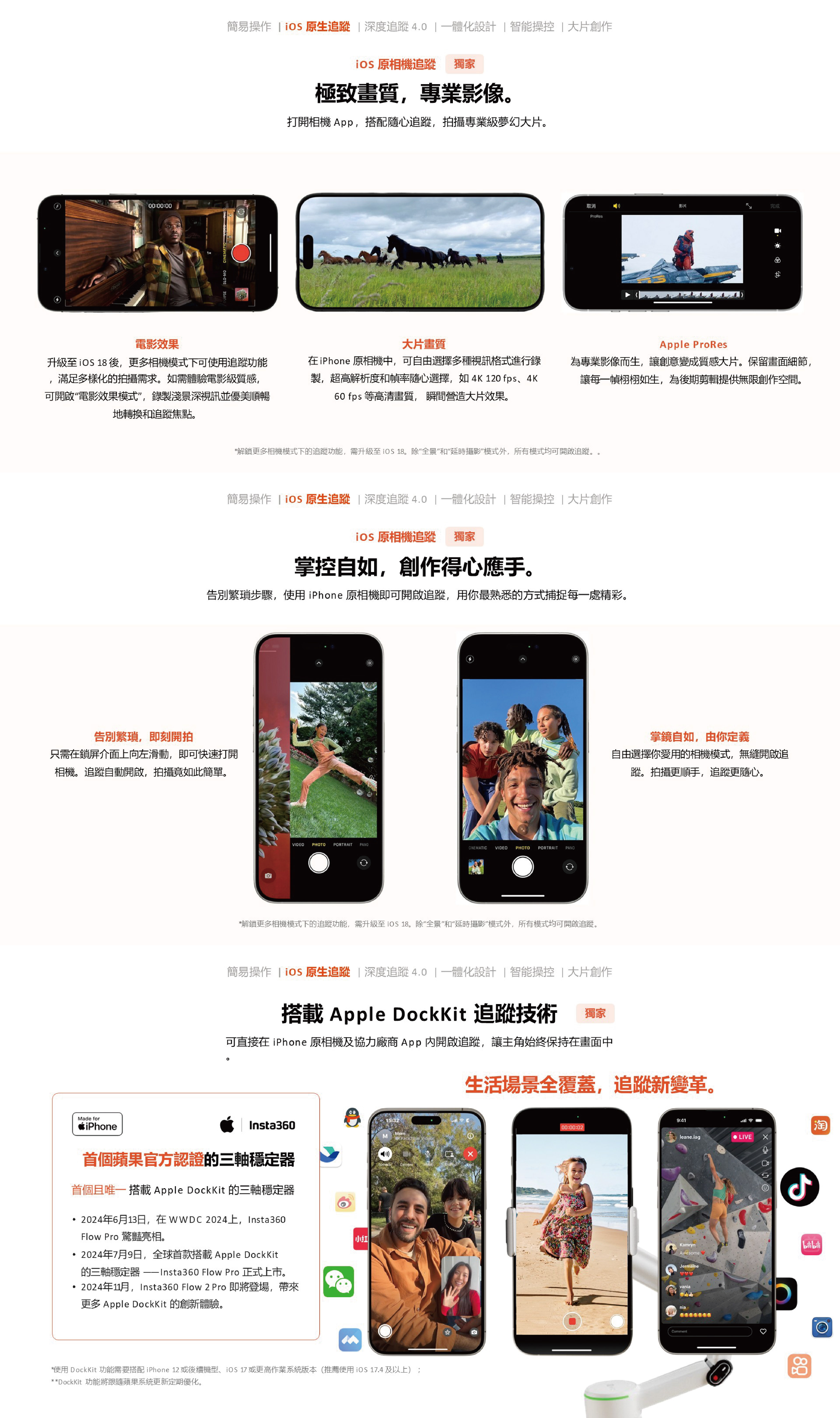 全方位操作升級:支持 Apple DockKit 原生追踪,搭配 Insta360 App 解鎖多種創意模式。