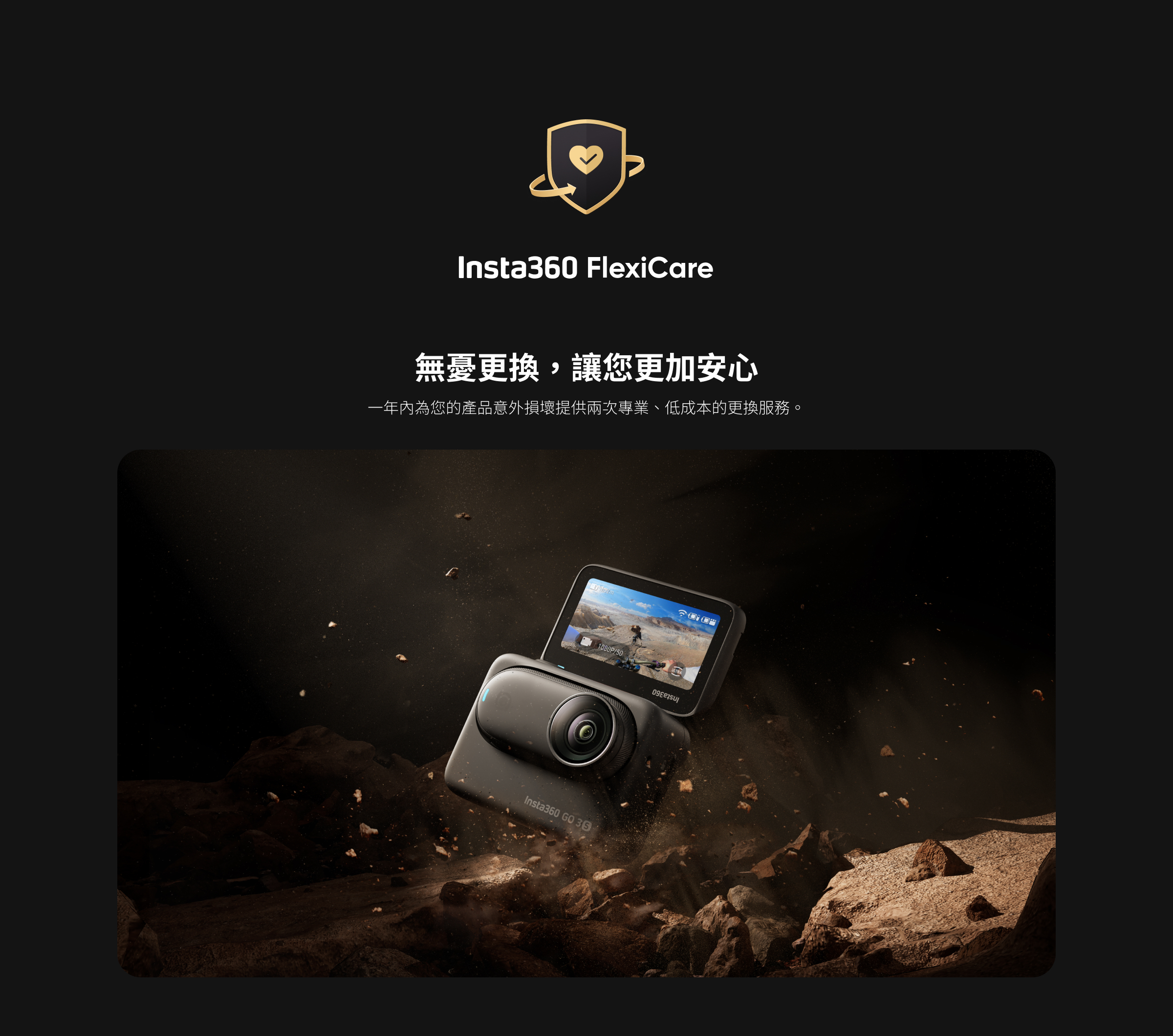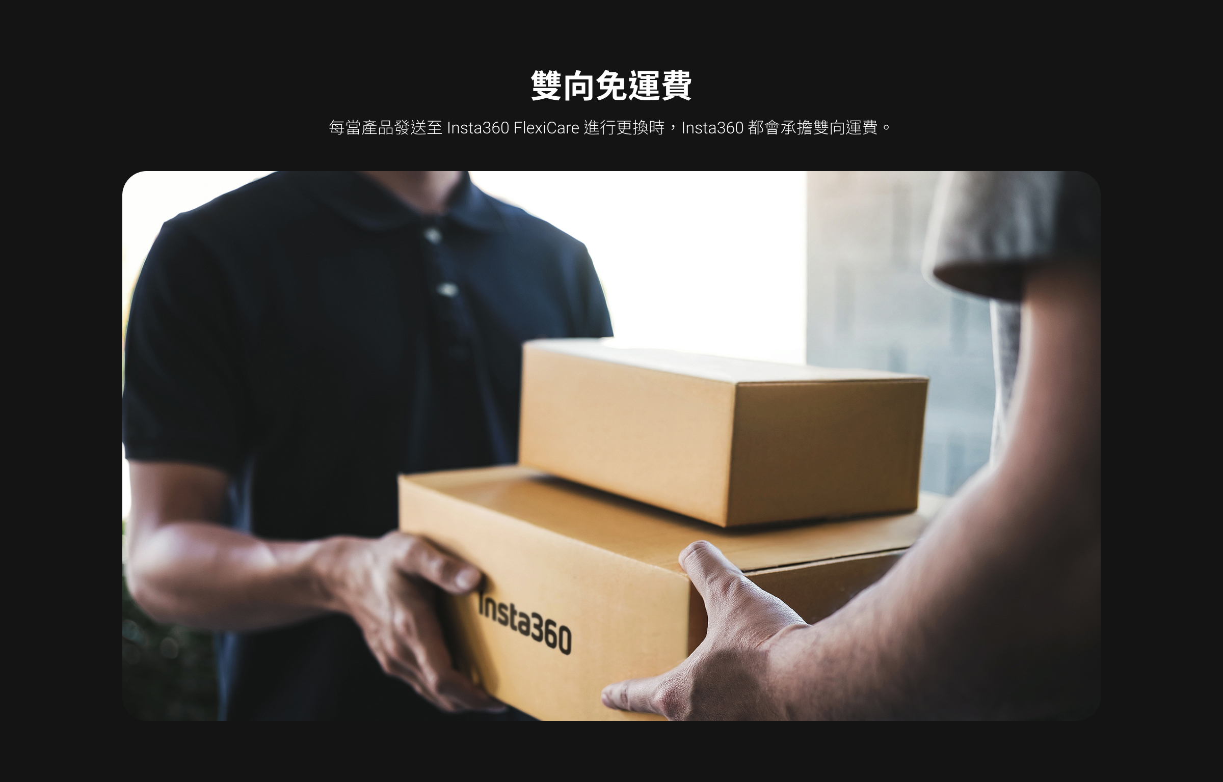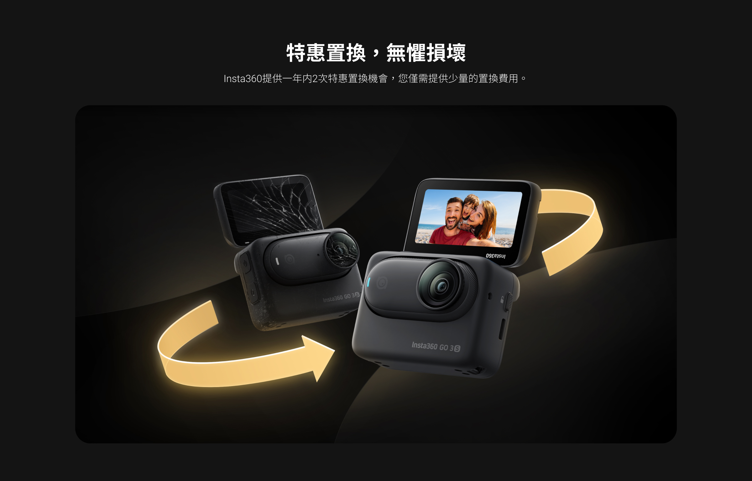 Insta360 FlexiCare 一年內提供兩次更換服務。 Insta360 將更換損壞的產品並承擔雙向運費。 用戶每次使用該服務需支付NT$899的小額更換費用。