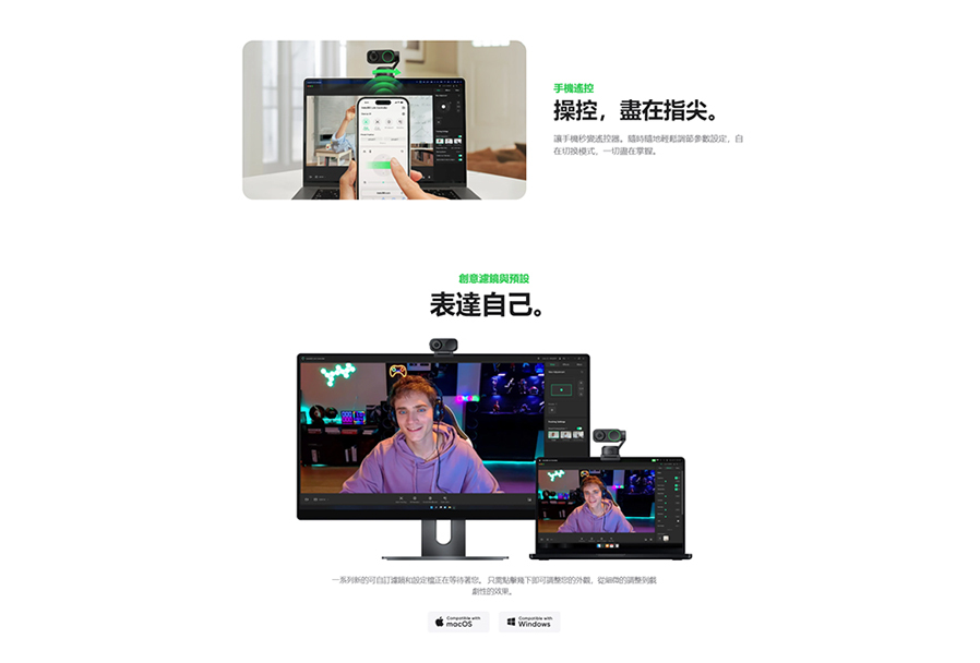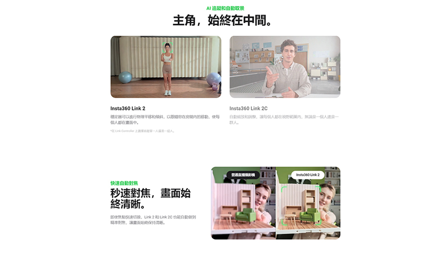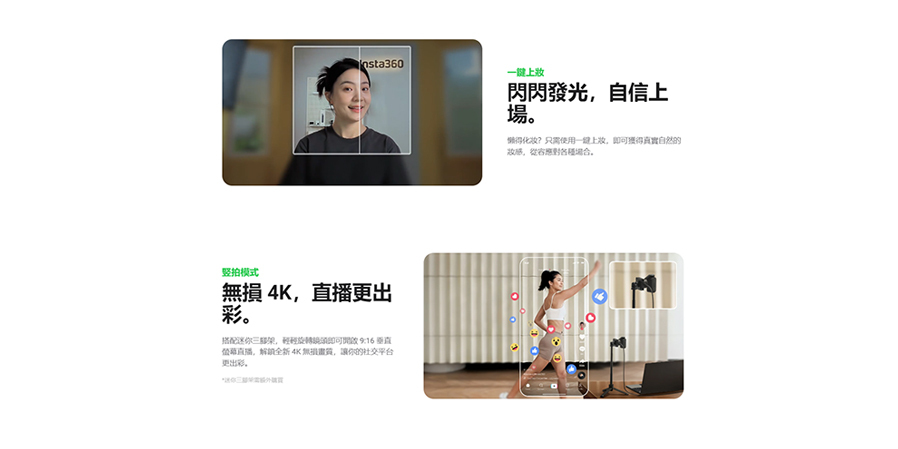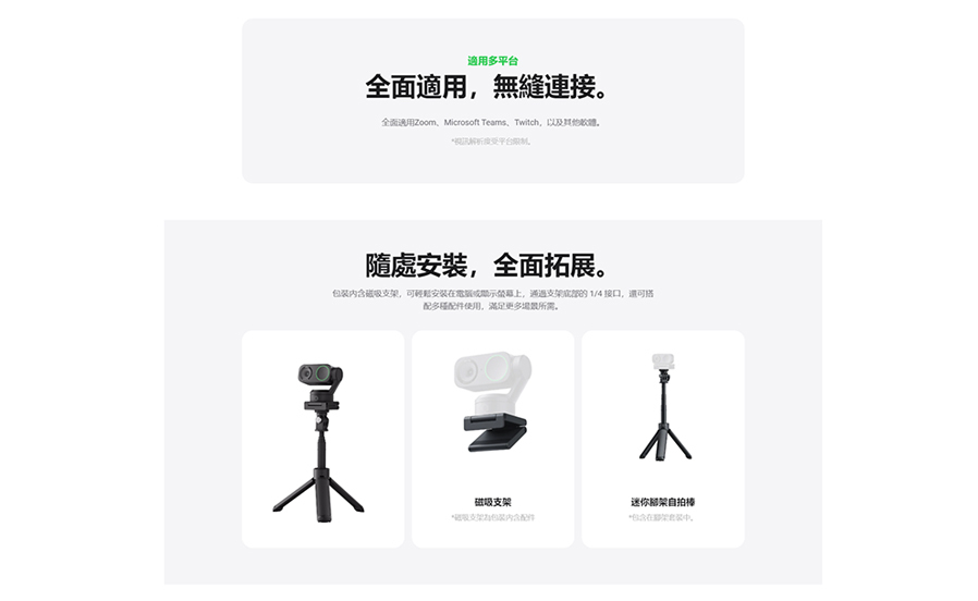 噪音消除。 憑藉全新的磁吸支架和人工智慧追蹤、自動取景、手勢控制、可自訂背景和自然模糊等