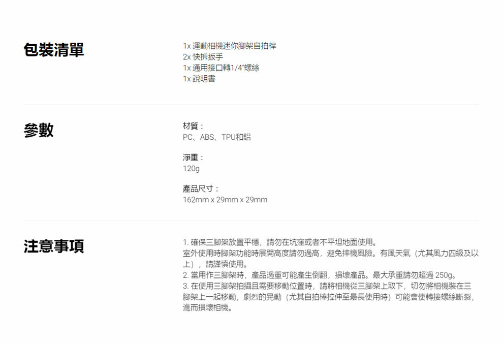 迷你輕巧便攜配件包括:運動相機迷你腳架自拍桿*1、快拆扳手*2、通用接口轉1/4"螺絲*1、說明書*1