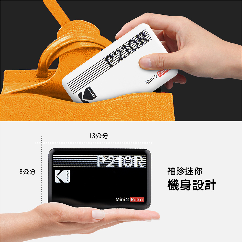 KODAK P210R 具備13x8x2cm的小巧尺寸,放在隨身包甚至口袋無負擔。